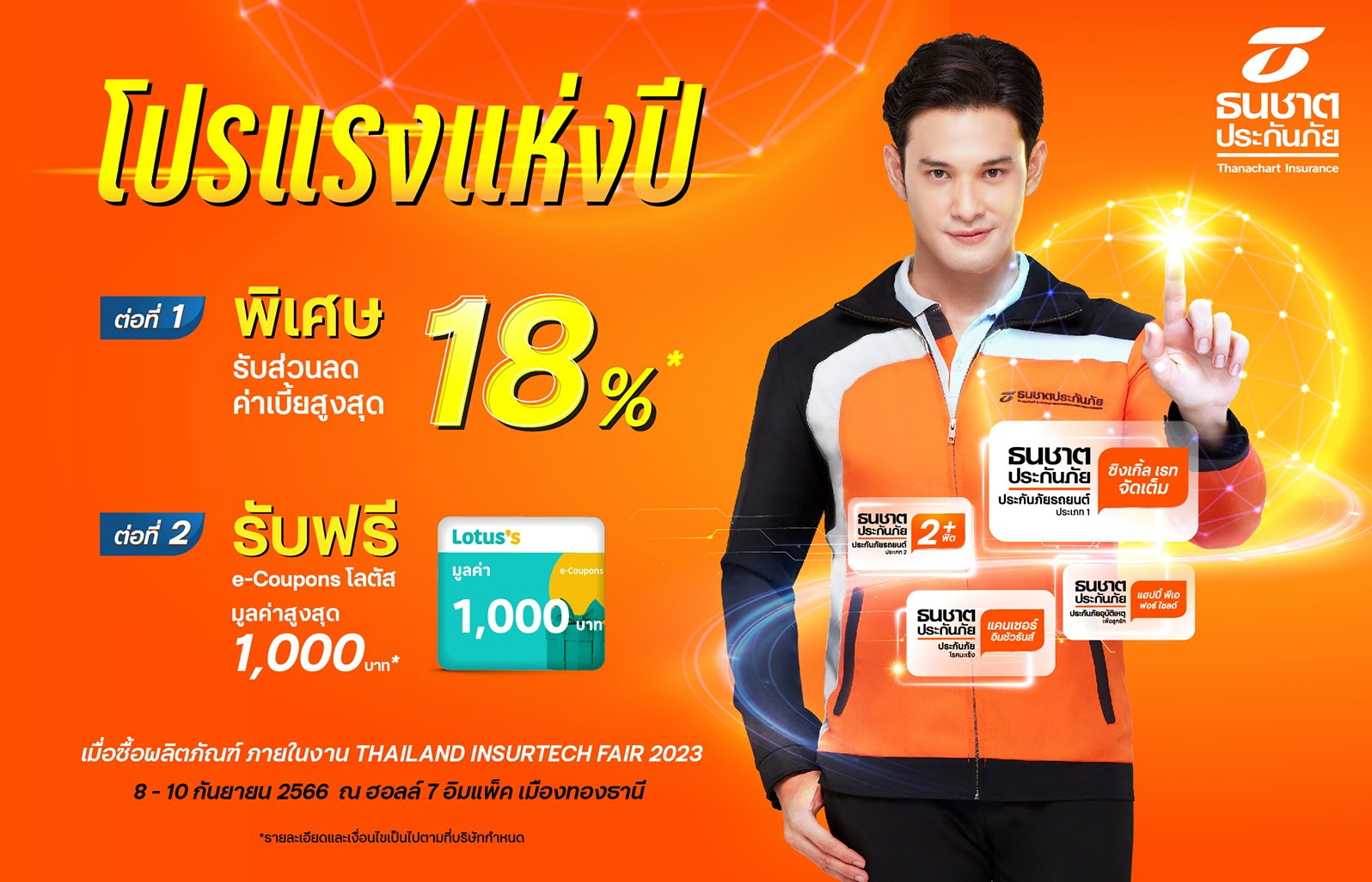 ธนชาตประกันภัย ตอกย้ำความเป็นผู้นำนวัตกรรมประกันภัย ส่งโปรแรงแห่งปีร่วมตอบโจทย์ทุกความต้องการของลูกค้า ในงาน Thailand InsurTech Fair 2023 โดยนำผลิตภัณฑ์เด่นที่ได้รับความนิยมจากลูกค้าเข้าร่วมจำหน่ายภายในงาน พร้อมรับโปรโมชั่นพิเศษ อาทิ รับส่วนลดค่าเบี้ยสูงสุด 18% หรือเลือกผ่อนชำระค่าเบี้ยประกันภัย 0% ได้นานสูงสุดถึง 10 เดือน พร้อมรับฟรี! e–Coupons Lotus เมื่อซื้อผลิตภัณฑ์ที่ร่วมรายการสูงสุด 1,000 บาท ห้ามพลาด! วันที่ 8 – 10 กันยายน 2566 ที่ บูธธนชาตประกันภัย ณ อิมแพคเมืองทองธานี ฮอลล์ 7