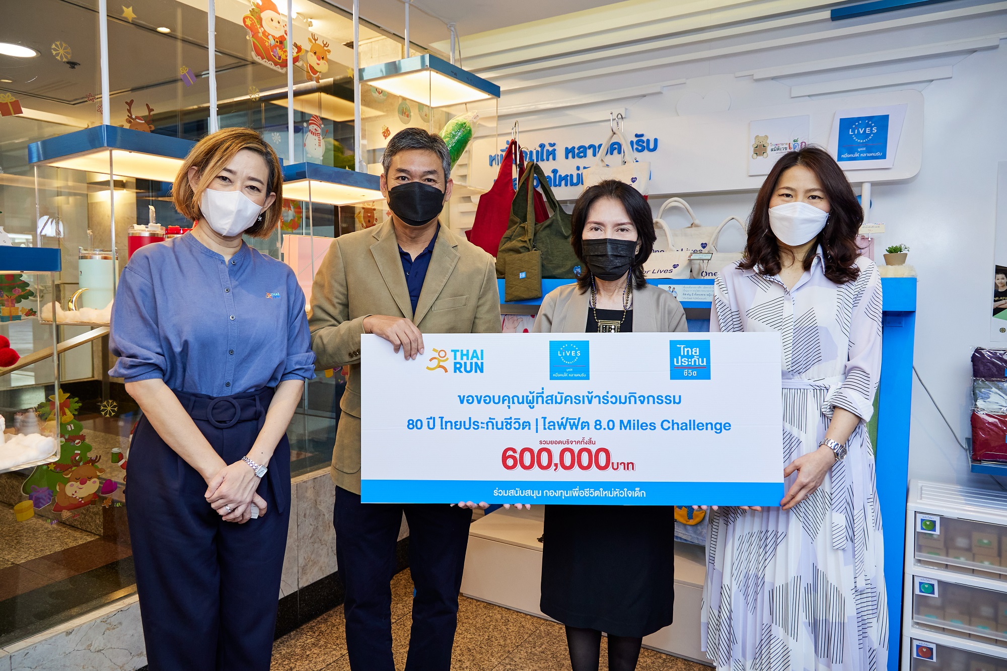 นางสาวฐิติมา เลี้ยงพาณิชย์ ผู้อำนวยการฝ่าย กลุ่มสื่อสารองค์กร บริษัท ไทยประกันชีวิต จำกัด (มหาชน) และนายประวีณ มากบุญส่งCOO บริษัท ไทยดอทรัน จำกัด ร่วมมอบเงินบริจาคจำนวน 600,000 บาท จากการจัดกิจกรรม 80 ปี ไทยประกันชีวิต ไลฟ์ฟิต 8.0 MilesChallenge แก่นางสาวภาสินี ปรีชาธนาพล กรรมการและเลขานุการ มูลนิธิหนึ่งคนให้ หลายคนรับ เพื่อสมทบทุนโครงการ “หนึ่งคนให้ หลายคนรับ เพื่อชีวิตใหม่หัวใจเด็ก” สำหรับเป็นค่าใช้จ่ายผ่าตัดผู้ป่วยเด็กโรคหัวใจที่ขาดแคลนทุนทรัพย์ ณ อาคารไทยประกันชีวิต สำนักงานใหญ่