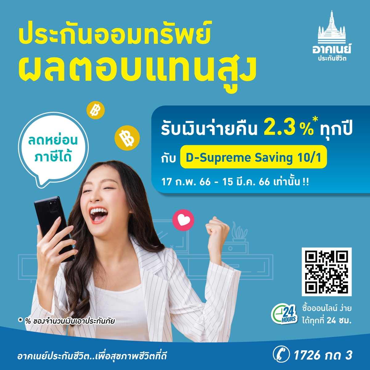 โดยประกันสะสมทรัพย์ D-Supreme Saving 10/1 (2.3%) จากอาคเนย์ประกันชีวิต มีจุดเด่นเรื่อง จ่ายเบี้ยครั้งเดียวจบไม่วุ่นวาย ไม่มีภาระทยอยจ่ายในปีต่อๆ ไป และมีเงินจ่ายคืนให้ 2.3% ของจำนวนเงินเอาประกันภัยทุกปีตลอด 10 ปี และเมื่อครบกำหนดอายุสัญญา ก็รับเงินก้อนคืนอีก 100% ซึ่งจะได้รับผลประโยชน์รวมแล้วถึง 123% รวมทั้งให้ความคุ้มครองชีวิต 110% ของจำนวนเงินเอาประกันภัย และสามารถนำไปลดหย่อนภาษีได้สูงสุด 100,000 บาท ตามหลักเกณฑ์ และเงื่อนไขของกรมสรรพากร