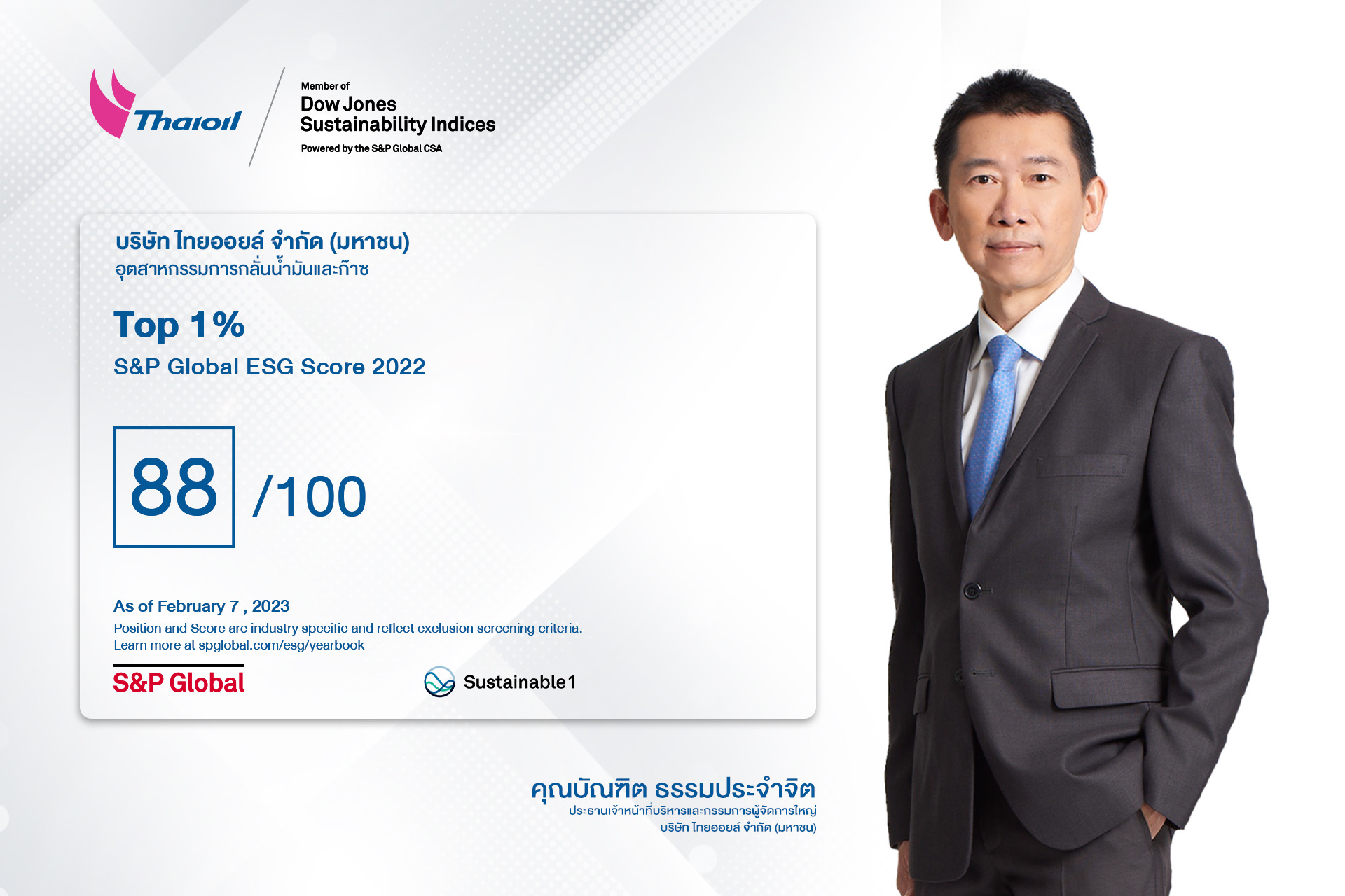 บริษัท ไทยออยล์ จำกัด (มหาชน) ได้รับการประเมินด้านความยั่งยืนระดับ “Top 1% S&P Global ESG Score 2022” ของกลุ่มอุตสาหกรรมการตลาดและการกลั่นน้ำมันและก๊าซ ในรายงานSustainability Yearbook 2023 จาก S&P Global
