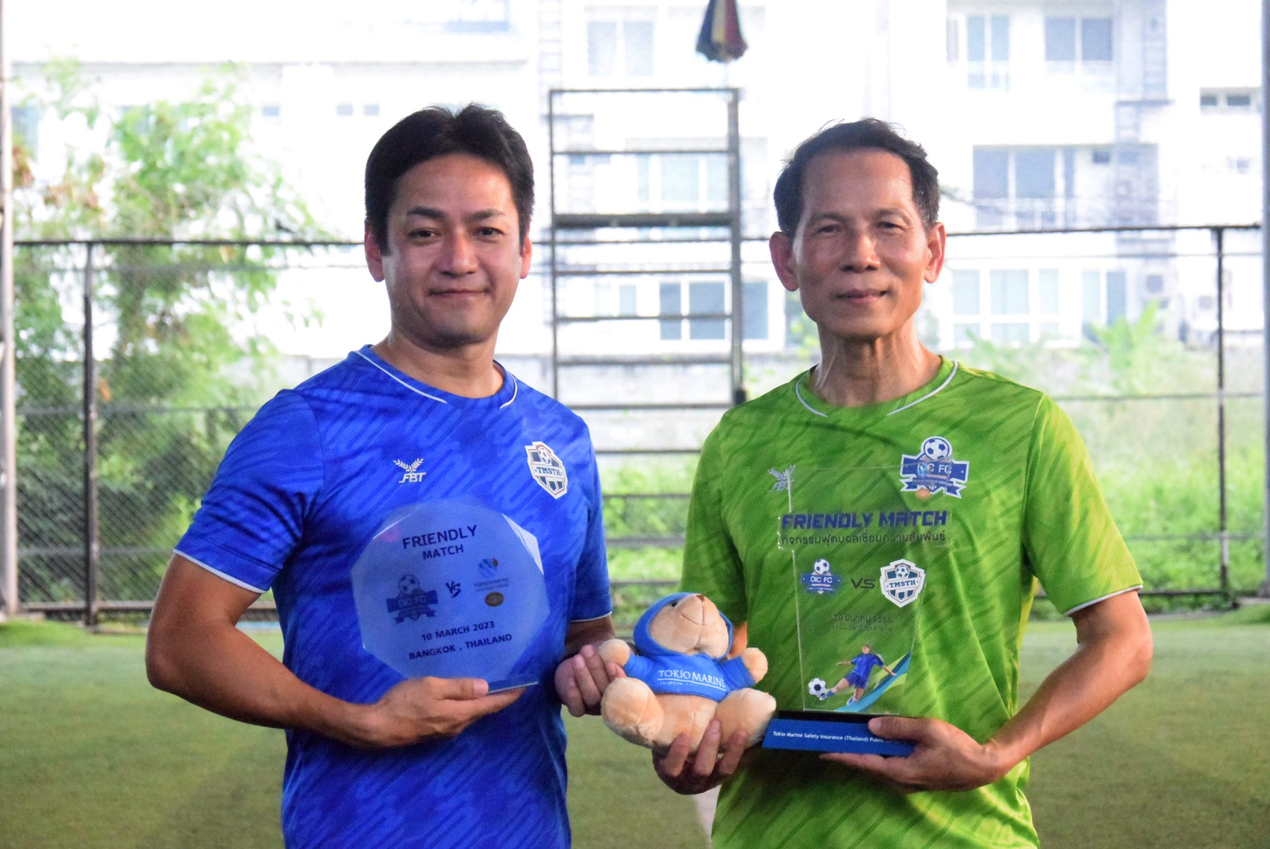 บริษัท คุ้มภัยโตเกียวมารีนประกันภัย (ประเทศไทย) จำกัด (มหาชน) โดยนายโนบุฟูมิ ยาซุเอะ ประธานเจ้าหน้าที่บริหาร (ซ้าย) นำทีมผู้บริหารและพนักงานร่วมแข่งขันฟุตบอลนัดกระชับมิตรกับผู้บริหารและเจ้าหน้าที่จากสำนักงานคณะกรรมการกำกับและส่งเสริมการประกอบธุรกิจประกันภัย (คปภ.) นำทีมโดยนายชัยยุทธ มังศรี รองเลขาธิการ ด้านกฎหมาย คดี และคุ้มครองสิทธิประโยชน์ (ขวา) เพื่อตอกย้ำความสัมพันธ์อันดีระหว่างกัน ตลอดจนเสริมสร้างสุขภาพที่ดีให้กับบุคลากร ณ สนามฟุตบอล Super Star Arena ซอยลาดพร้าว 80 เขต วังทองหลาง กรุงเทพมหานคร เมื่อวันที่ 10 มีนาคม 2566
