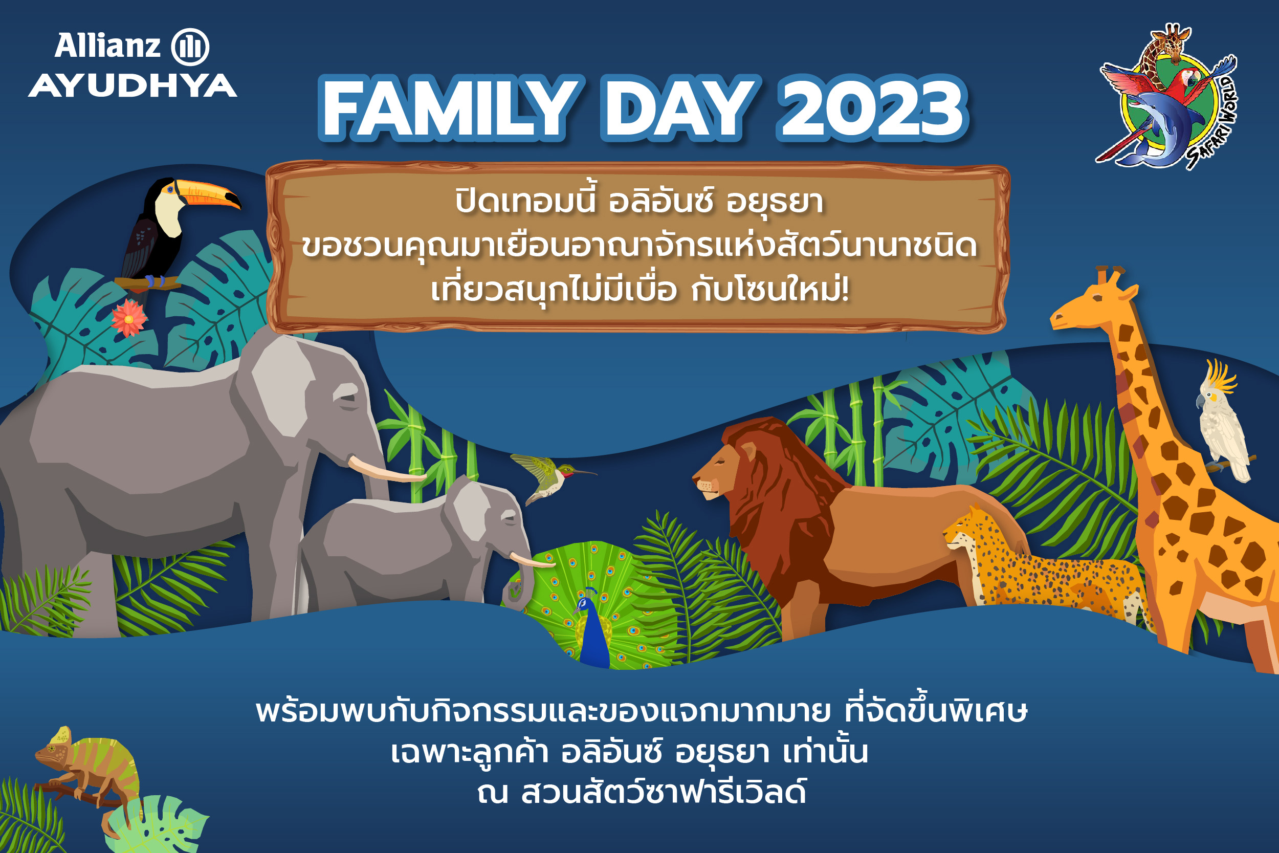 กลับมาแล้ว กับกิจกรรมที่รอคอย “ Allianz Ayudhya Family Day 2023” ชวนลูกค้าและครอบครัว มาเยือนสวนสัตว์ซาฟารีเวิลด์ อาณาจักรแห่งสัตว์นานาชนิด และเพลิดเพลินไปกับโซนใหม่ กับฝูงสัตว์สุดน่ารักที่คอยต้อนรับ นอกจากนี้ยังมีกิจกรรมพิเศษและของรางวัลอีกมากมายให้ร่วมสนุก เติมรอยยิ้มให้กันทั้งครอบครัว พบกันวันอาทิตย์ที่ 23 เมษายน 2566 ตั้งแต่เวลา 9.00 น. เป็นต้นไป ณ สวนสัตว์ซาฟารีเวิลด์