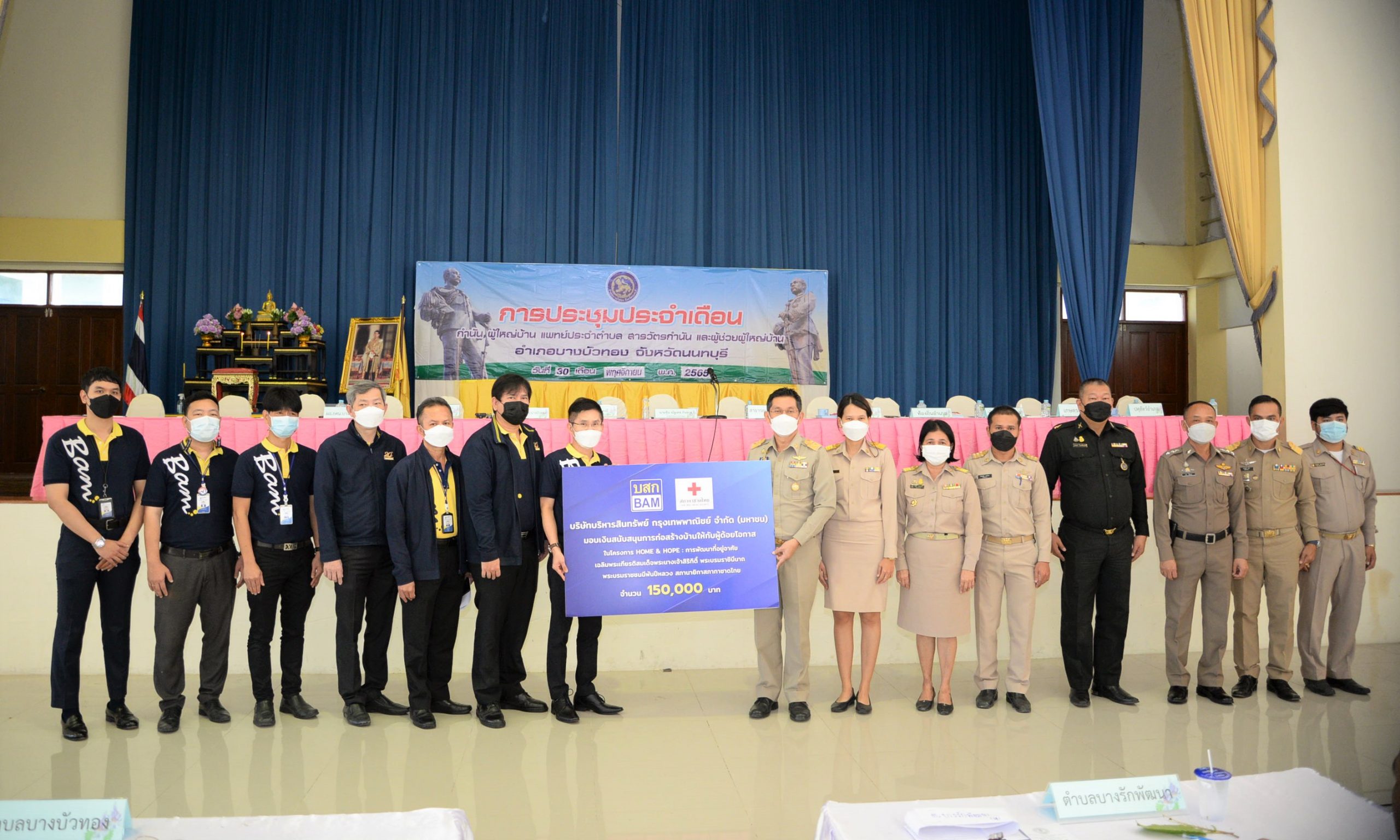 นายชัชวาลย์ เจษฎาคุปต์ ผู้อำนวยการฝ่ายพัฒนาสินทรัพย์นนทบุรี พร้อมพนักงาน บริษัทบริหารสินทรัพย์ กรุงเทพพาณิชย์ จำกัด (มหาชน) หรือ BAMมอบเงินสนับสนุนการก่อสร้างบ้านให้กับผู้ด้อยโอกาส ในพื้นที่อำเภอบางบัวทอง จังหวัดนนทบุรี จำนวน 150,000 บาท โดยมี นายชุ้น ณัฐเดช กังสุกุล นายอำเภอบางบัวทอง และนายยศวัฒน์ คงมี ปลัดอาวุโสพร้อมหัวหน้าส่วนราชการ กำนัน ผู้ใหญ่บ้าน สารวัตรกำนัน แพทย์ประจำตำบล และผู้ช่วยผู้ใหญ่บ้าน อำเภอบางบัวทอง จังหวัดนนทบุรี เป็นผู้แทนรับมอบ