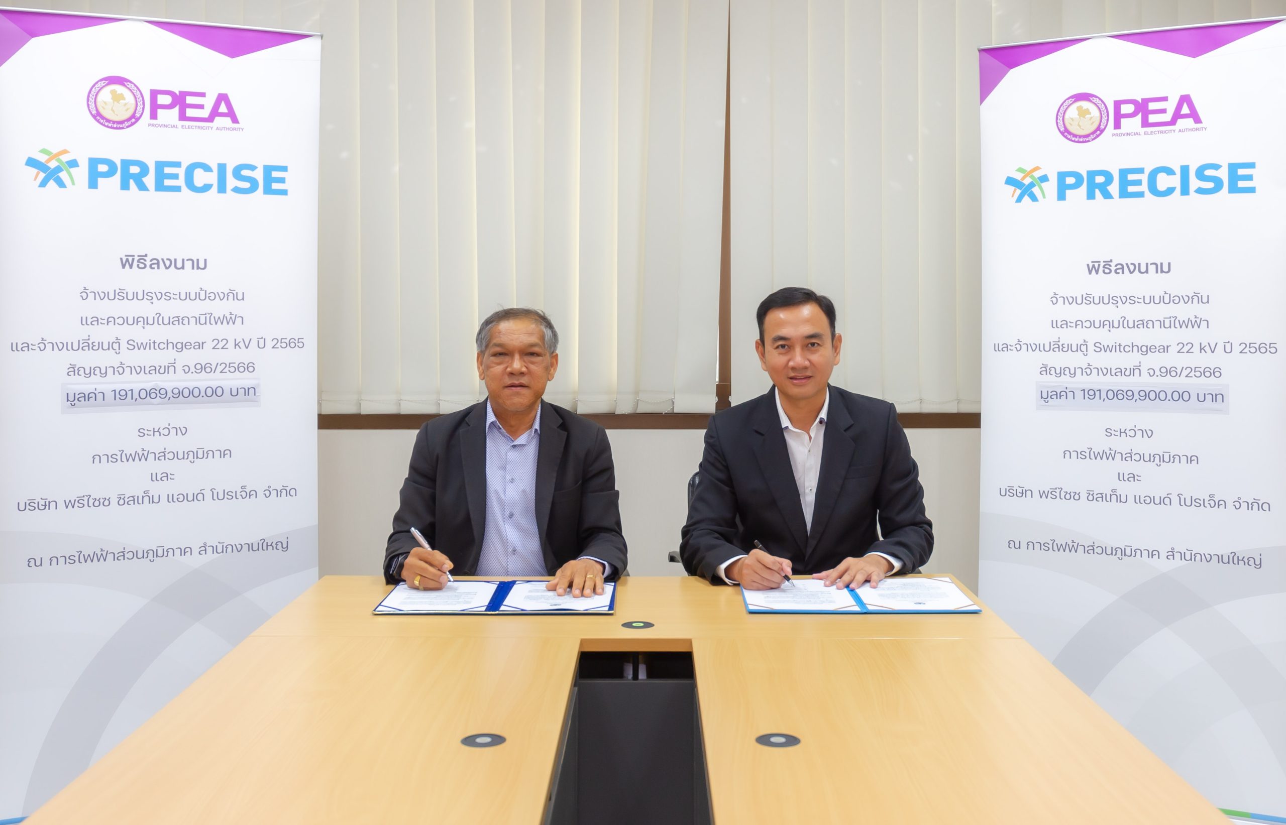 คุณปราโมทย์ สุดทรัพย์ รองผู้ว่าการปฏิบัติการและบำรุงรักษา การไฟฟ้าส่วนภูมิภาค (กฟภ.) หรือ PEA และคุณภาสกร นราบริรักษ์ ประธานเจ้าหน้าที่ปฏิบัติการตามสายธุรกิจ บริษัท พรีไซซ ซิสเท็ม แอนด์ โปรเจ็ค จำกัด บริษัทในเครือ บริษัท พรีไซซ คอร์ปอเรชั่น จำกัด (มหาชน) หรือ PCC ร่วมลงนามสัญญาจ้างงานปรับปรุงระบบป้องกันและควบคุมในสถานีไฟฟ้าและจ้างเปลี่ยนตู้ Switchgear 22 kV ปี 2565 มูลค่า 191,069,900 บาท (รวมภาษีมูลค่าเพิ่ม) ณ การไฟฟ้าส่วนภูมิภาค สำนักงานใหญ่ เมื่อเร็วๆนี้