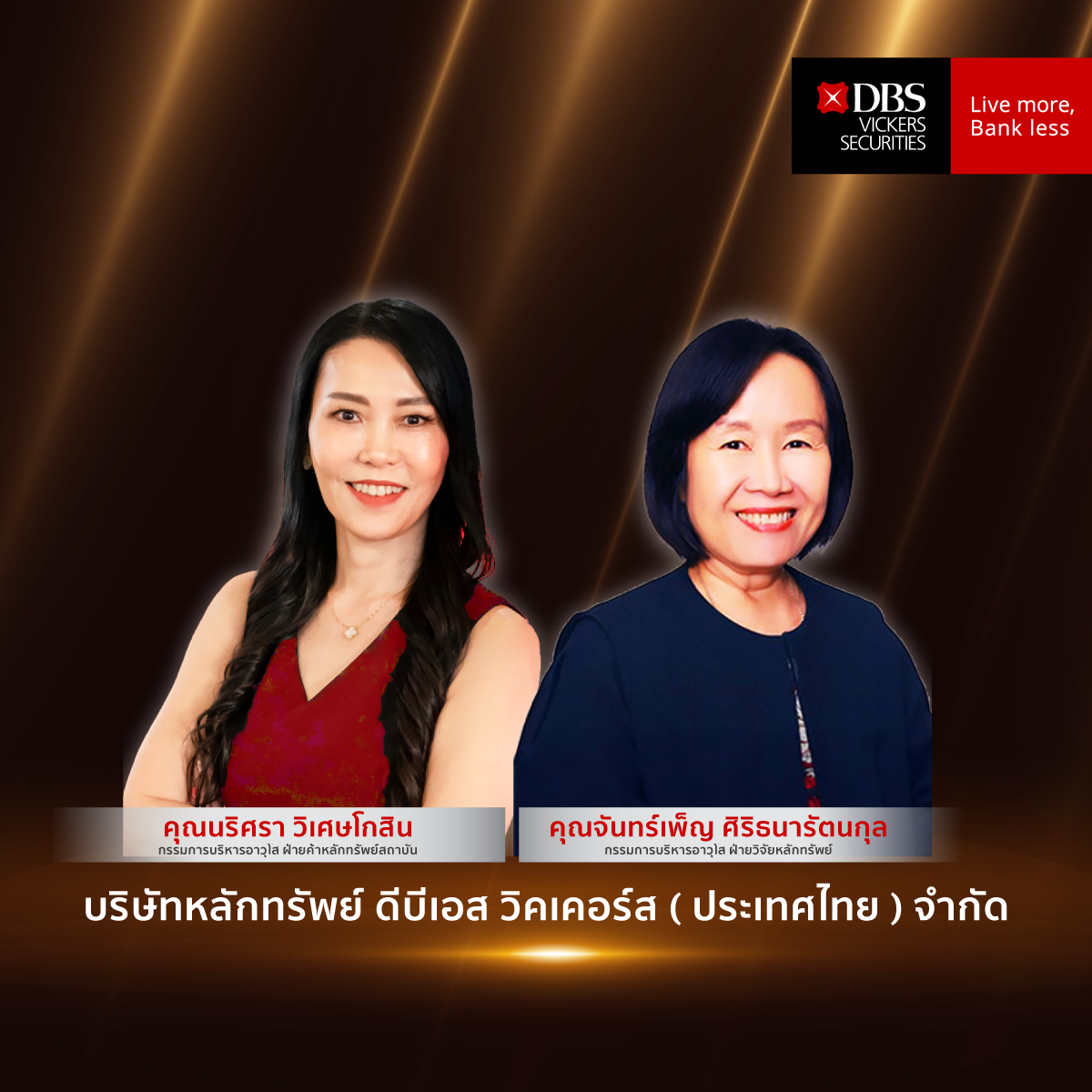 คุณจันทร์เพ็ญ ศิริธนารัตนกุล กรรมการบริหารอาวุโส ฝ่ายวิจัยหลักทรัพย์ บริษัทหลักทรัพย์ ดีบีเอส วิคเคอร์ส (ประเทศไทย) จำกัด (DBSV) กล่าวเพิ่มเติมว่า ทางทีมนักวิเคราะห์หลักทรัพย์ได้ทุ่มเทในการวิจัยหลักทรัพย์ และคัดสรรหุ้นที่มีปัจจัยพื้นฐานที่ดี รวมทั้งมีการจัดงานสัมมนาภายใน และโรดโชว์ภายนอกให้แก่นักลงทุน เพื่อให้นักลงทุนได้มีโอกาสพบกับบริษัทจดทะเบียน เพื่อเป็นการสร้างความมั่นใจและเพิ่มศักยภาพให้กับนักลงทุนมากยิ่งขึ้น