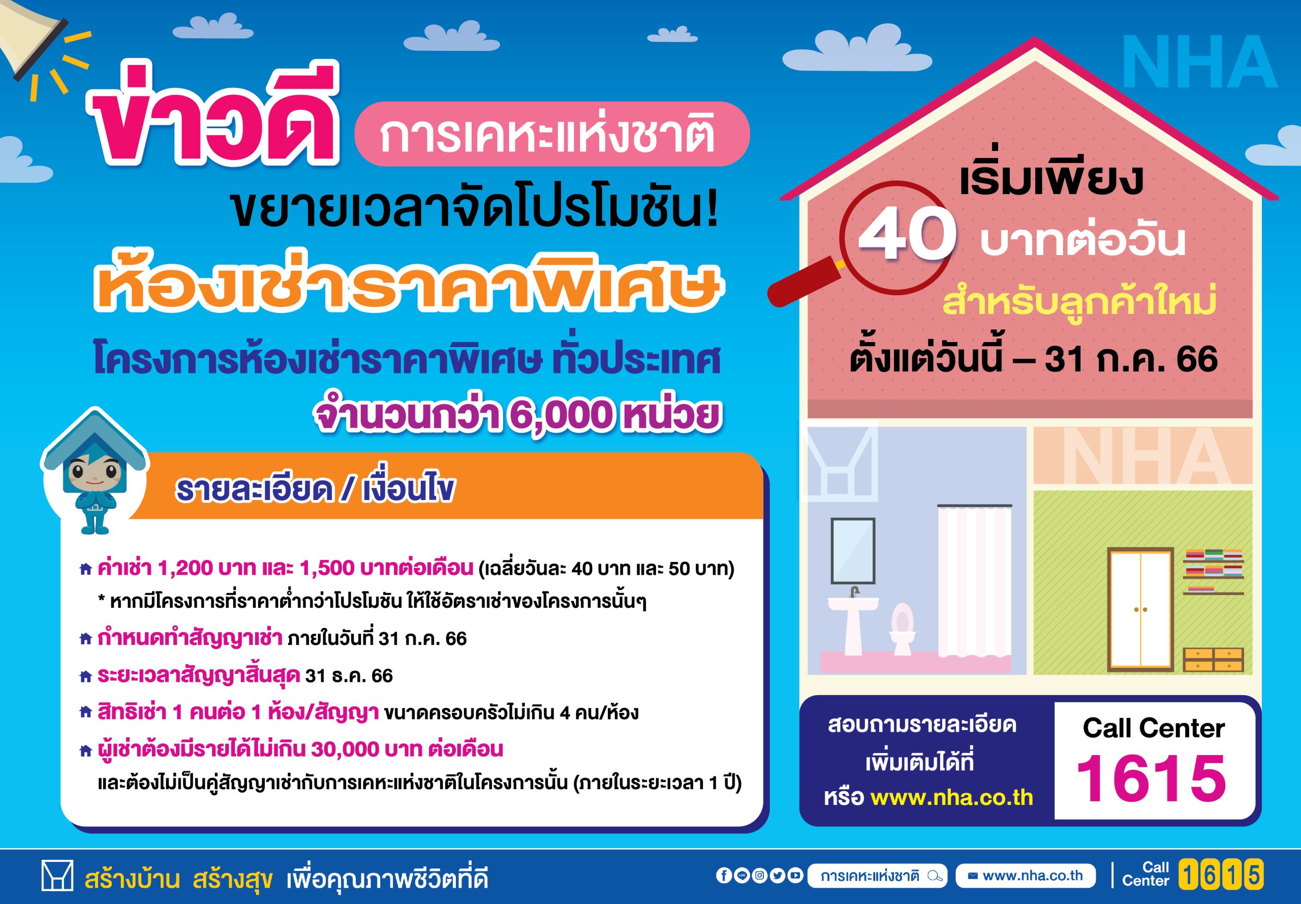 การเคหะแห่งชาติ ขยายระยะเวลาโปรโมชัน “ห้องเช่าราคาพิเศษ” อีก 3 เดือน สิ้นสุดวันที่ 31 กรกฎาคม 2566 จากเดิมหมดเขตวันที่ 30 เมษายน 2566 เพื่อช่วยเหลือกลุ่มผู้มีรายได้น้อยและครัวเรือนเปราะบางทั่วประเทศสามารถเข้าถึงที่อยู่อาศัยได้มากยิ่งขึ้น