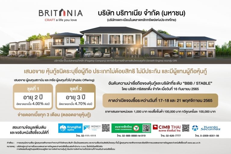 นับถอยหลังกับการเสนอขายหุ้นกู้ครั้งแรกพร้อมกัน 2 ชุด ที่ได้รับการจัดเครดิตเรตติ้ง BBB แนวโน้ม Stable จากทริสเรทติ้ง เมื่อวันที่ 16 กันยายนที่ผ่านมา ซึ่งเป็นระดับ Investment Grade สะท้อนถึงความน่าเชื่อถือและศักยภาพการเติบโตที่แข็งแกร่งของบริษัทฯ ล่าสุด ‘ศุภลักษณ์ จันทร์พิทักษ์’ ซีอีโอหญิง บมจ.บริทาเนีย หรือ BRI ผู้เชี่ยวชาญการพัฒนาอสังหาริมทรัพย์แนวราบ อัปเดตความคืบหน้าในวันที่ 17 – 18 และ 21 พฤศจิกายนนี้
