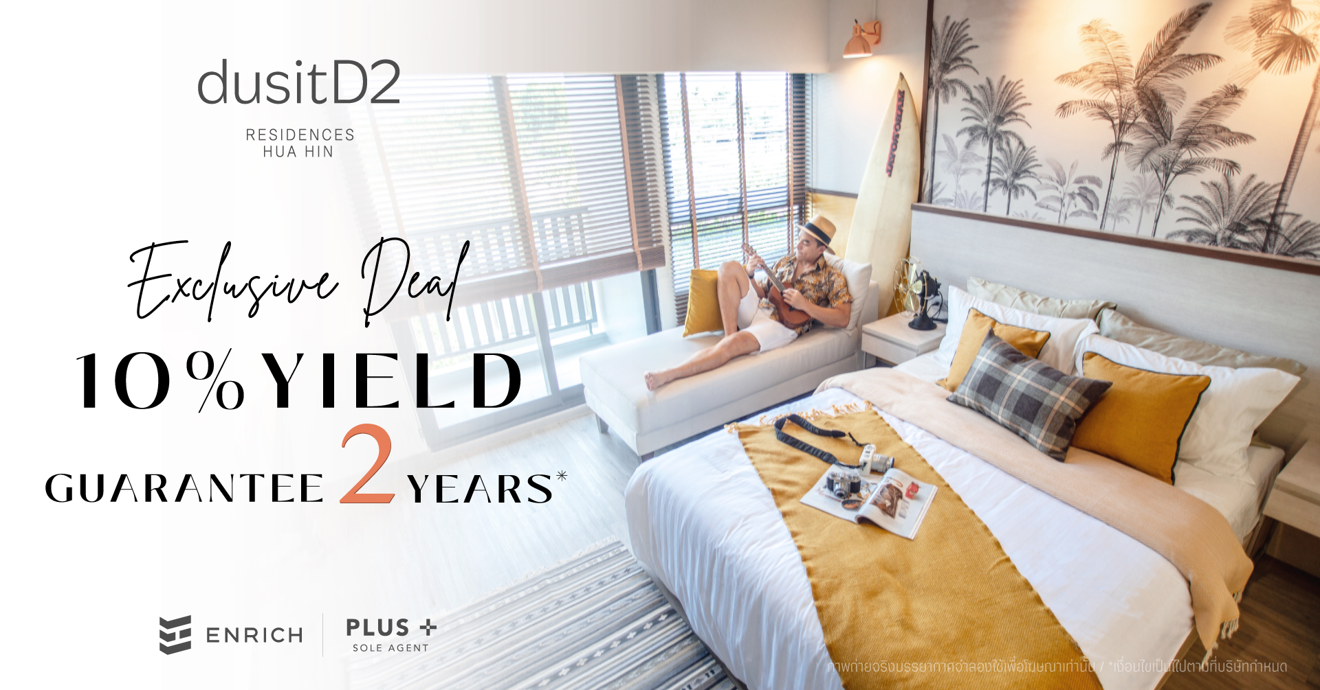 ในเดือนพฤษภาคมนี้ทางโครงการดีทู เรสซิเดนเซส หัวหิน มีโปรโมชั่นพิเศษสำหรับผู้ที่สนใจ ด้วยทำราคาพิเศษเพียง 2.45 ล้านบาท (จำนวนจำกัด) พร้อมการันตีค่าเช่าสูงถึง 10% นานถึง 2 ปี* ฟรีเฟอร์นิเจอร์ เครื่องใช้ไฟฟ้า* ฟรีโอนกรรมสิทธ์ และค่าส่วนกลาง 2 ปี* พร้อมที่พักโรงแรม dusitD2 Hua Hin 10 คืน โครงการดีทู เรสซิเดนเซส หัวหิน เป็นอีกโครงการที่ตอบโจทย์กลุ่มลูกค้าที่มองหาคอนโดมิเนียมสำหรับพักอาศัยในการพักผ่อนและลงทุนที่คุมค่าที่สุดในหัวหินได้เป็นอย่างดี สำหรับลูกค้าที่สนใจเยี่ยมชมโครงการ สามารถลงทะเบียนได้ที่ www.plus.co.th/service/sole-agent