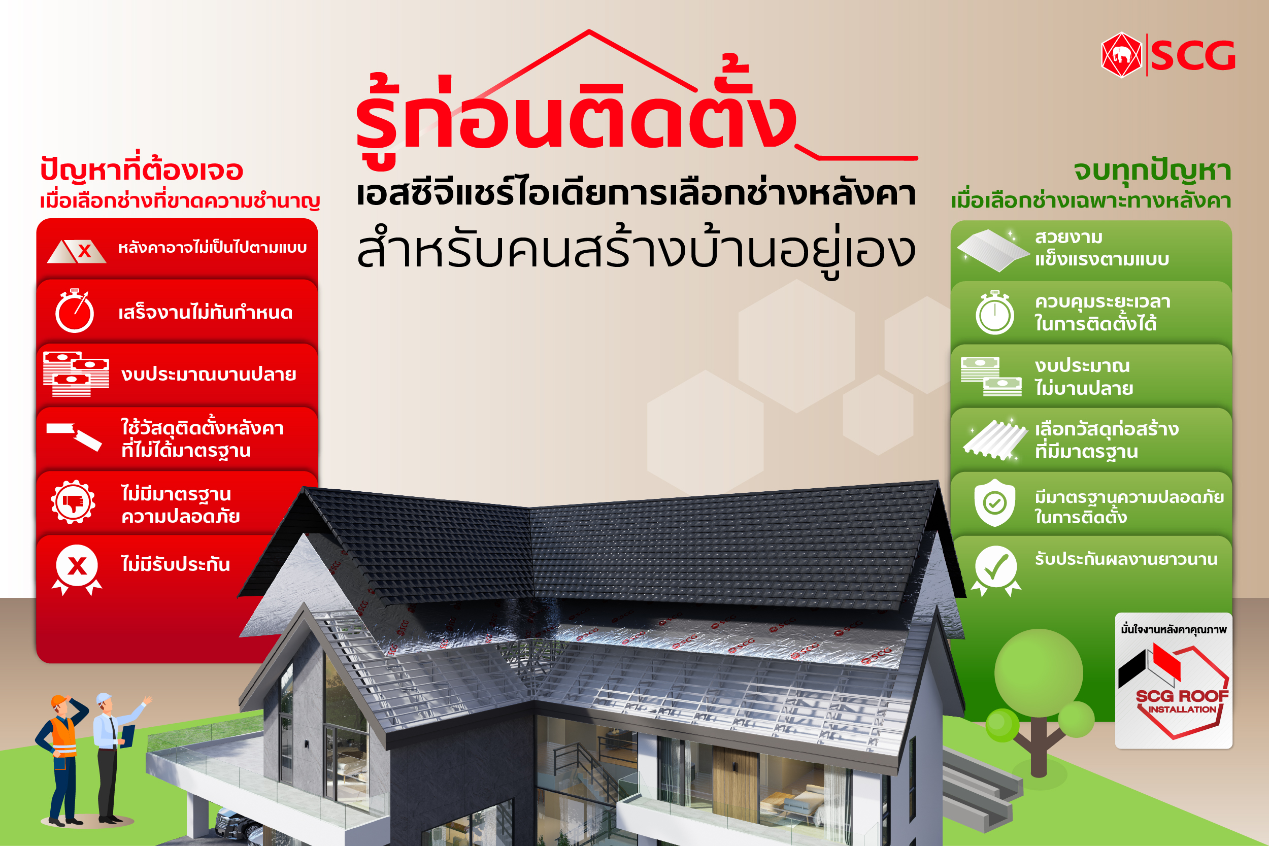 จะเห็นว่าการรับบริการจากช่างมืออาชีพ มีประสบการณ์การทำงานมายาวนาน และมีมาตรฐานจากบริษัทชั้นนำที่เชื่อถือได้การันตีผลงาน จึงปลอดภัยและคุ้มค่ากว่าการจ้างช่างมุงหลังคาทั่วไป ซึ่ง “SCG Roof Installation” ก็เป็นอีกหนึ่งทางเลือกที่มีมาตรฐานการติดตั้งในระดับสากล โดยเอสซีจีมีทีมช่างหลังคาประสบการณ์ด้านหลังคามากกว่า 80 ปี ทำให้มั่นใจได้ว่าหลังคาบ้านใหม่ของเราจะออกมาดีได้คุณภาพ รายละเอียดเพิ่มเติม และเอสซีจียังรับประกันผลงานการติดตั้งหลังคาใหม่ โดยมีแพ็คเกจให้เลือกหลากหลายแบบด้วยกัน ที่นิยมคือ TOP HAT แพ็กเกจมุงหลังคาระดับพรีเมียม รับประกัน 10 ปี, COMPLETE ROOF รับประกัน 5 ปี และ VALUE ROOF รับประกัน 2 ปี ซึ่งแน่นอนว่าเรื่องความปลอดภัยทางเอสซีจีได้คัดสรรและอบรมช่างมืออาชีพมาอย่างดี มีความชำนาญเฉพาะด้าน ไว้วางใจได้ นอกจากนี้เจ้าของบ้านยังมั่นใจเรื่องระยะเวลาการติดตั้งได้ว่าจะไม่เลยกำหนด โดยสามารถติดตามความคืบหน้าของงานอย่างใกล้ชิด