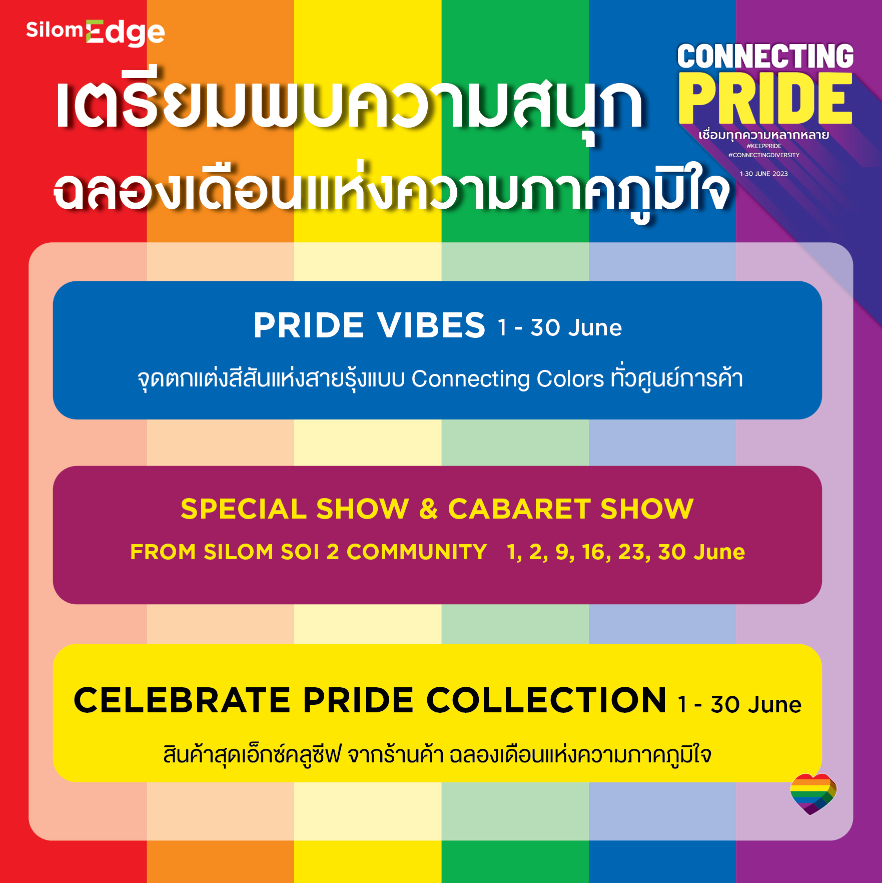 และ CABARET SHOW สุดจัดจ้าน จากสีลมซอย 2 ทุกวันศุกร์ เริ่มสตาร์ทความสนุกเวลา 18.30 – 20.00 น. บริเวณลานโปรโมชั่น ชั้น 2 สีลมเอจ พิเศษ! รับฟรี คูปอง Special Drink จากสีลมซอย 2, รับฟรี Pride Nail Painting จากร้าน Bloom หรือ รับฟรี เครื่องดื่มสูตรพิเศษ จากร้าน Throwback ตลอดทั้งเดือนมิถุนายน