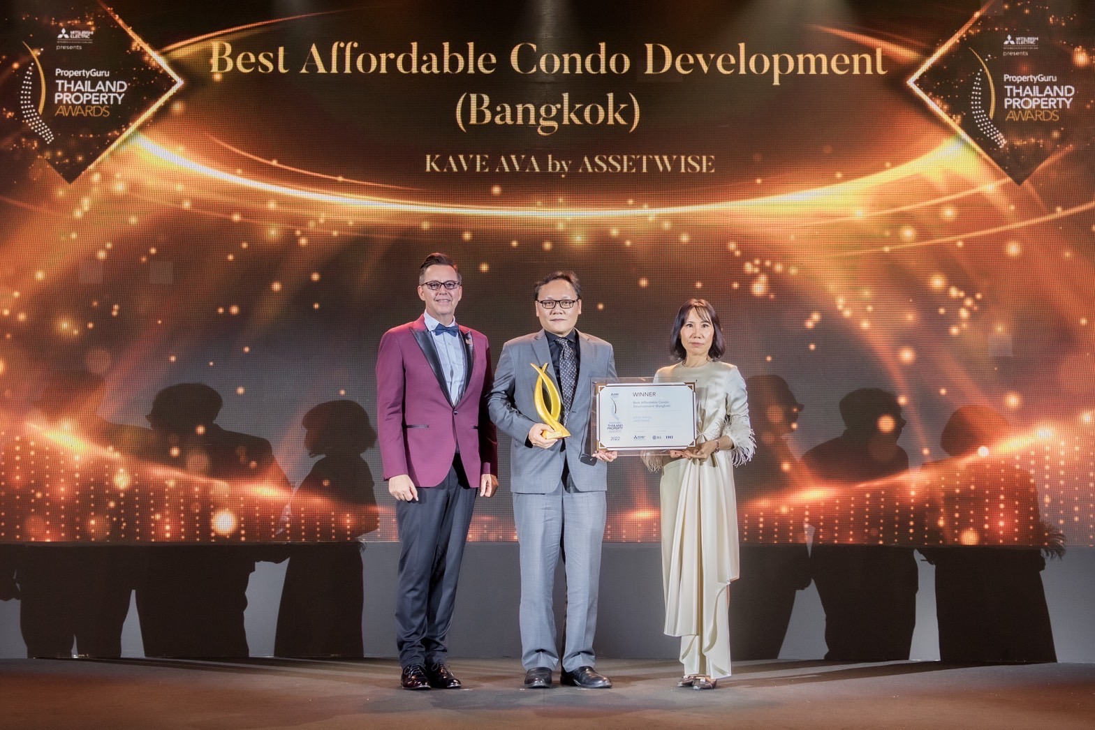 เวคิน ตั้งกุลวัฒน์ ประธานเจ้าหน้าที่สายงานพัฒนาธุรกิจ พร้อมด้วย นฤมล คุณาภิรัตนกุล รองประธานสายงานอาวุโสกลุ่มธุรกิจ 1 บริษัท แอสเซทไวส์ จำกัด (มหาชน) บริษัทพัฒนาอสังหาริมทรัพย์ที่เป็นผู้นำด้านไลฟ์สไตล์การอยู่อาศัย ภายใต้แนวคิด “ความสุขที่ออกแบบมาเพื่อคุณ” หรือ We Build Happiness” รับรางวัล Winner Award ในสาขา Best Affordable Condo Development (Bangkok) จากโครงการ “เคฟ เอวา” (Kave Ava)