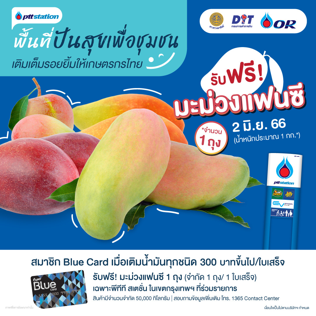 เพื่อนำมาจัดกิจกรรมให้แก่สมาชิกบลูการ์ดที่เติมน้ำมันชนิดใดก็ได้ครบ 300 บาทขึ้นไปต่อใบเสร็จ รับฟรีทันที! มะม่วงแฟนซี จำนวน 1 ถุง (1 กิโลกรัม) ณ พีทีที สเตชั่น เฉพาะพื้นที่กรุงเทพฯ ที่ร่วมรายการจำนวน 188 สถานี ในวันที่ 2 มิถุนายน 2566หรือจนกว่าสินค้าจะหมด สอบถามรายละเอียดเพิ่มเติมได้ที่ โทร. 1365 Contact Center และตรวจสอบรายชื่อ พีทีที สเตชั่น ที่เข้าร่วมรายการได้ที่ www.pttor.com
