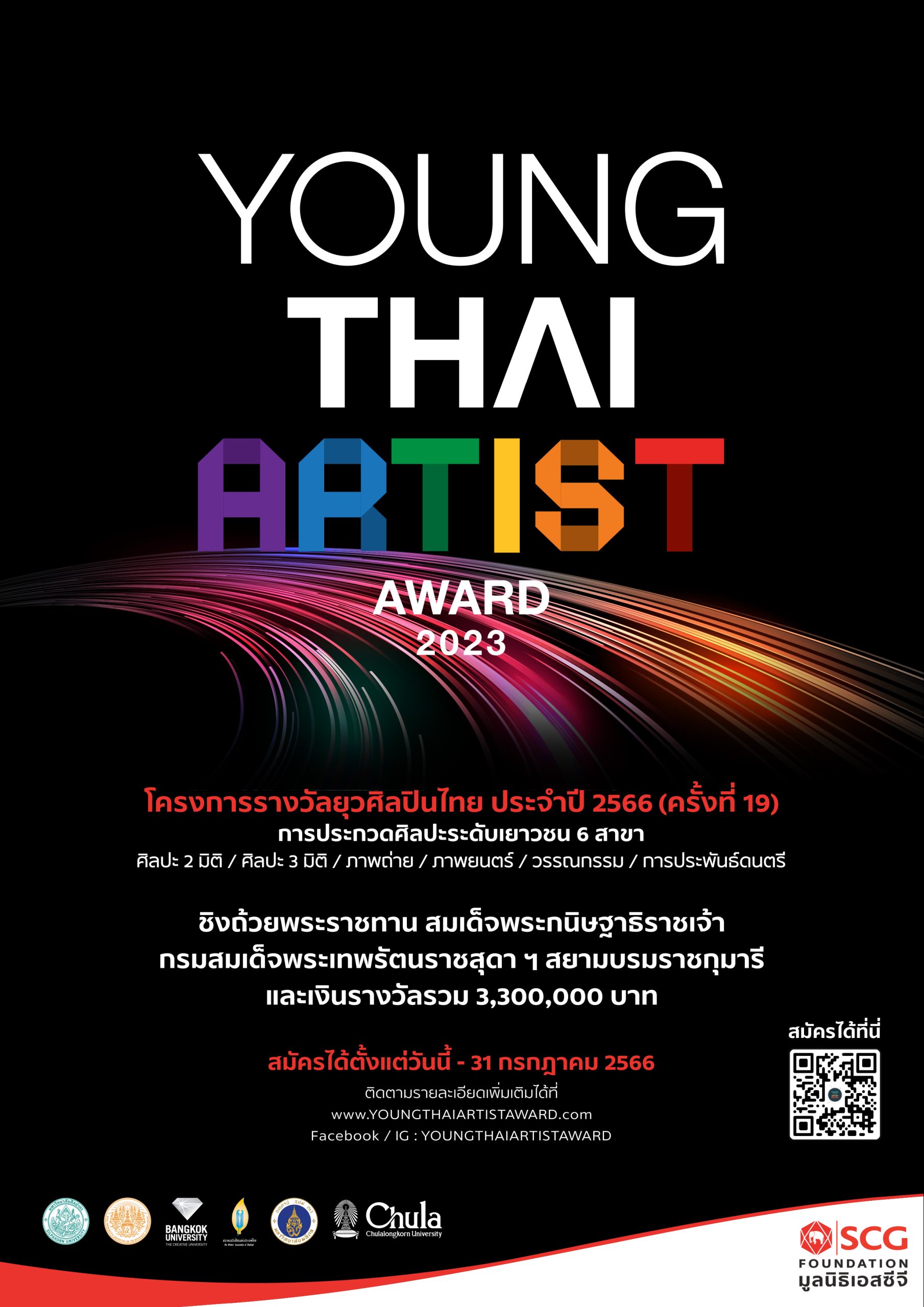 มูลนิธิเอสซีจี เปิดพื้นที่แห่งโอกาสให้เยาวชนที่มีใจรักการสร้างสรรค์งานศิลปะ ที่มีอายุระหว่าง 15-25 ปี ทั่วประเทศ ได้มีโอกาสประลองความคิดสร้างสรรค์ ประชันไอเดียศิลป์ เพื่อแจ้งเกิดเป็นยุวศิลปินเลือดใหม่ในวงการศิลปะ ด้วยการส่งผลงานเข้าประกวดในโครงการ “รางวัลยุวศิลปินไทย 2566” หรือ Young Thai Artist Award 2023 ชิงถ้วยพระราชทาน สมเด็จพระกนิษฐาธิราชเจ้า กรมสมเด็จพระเทพรัตนราชสุดาฯ สยามบรมราชกุมารี