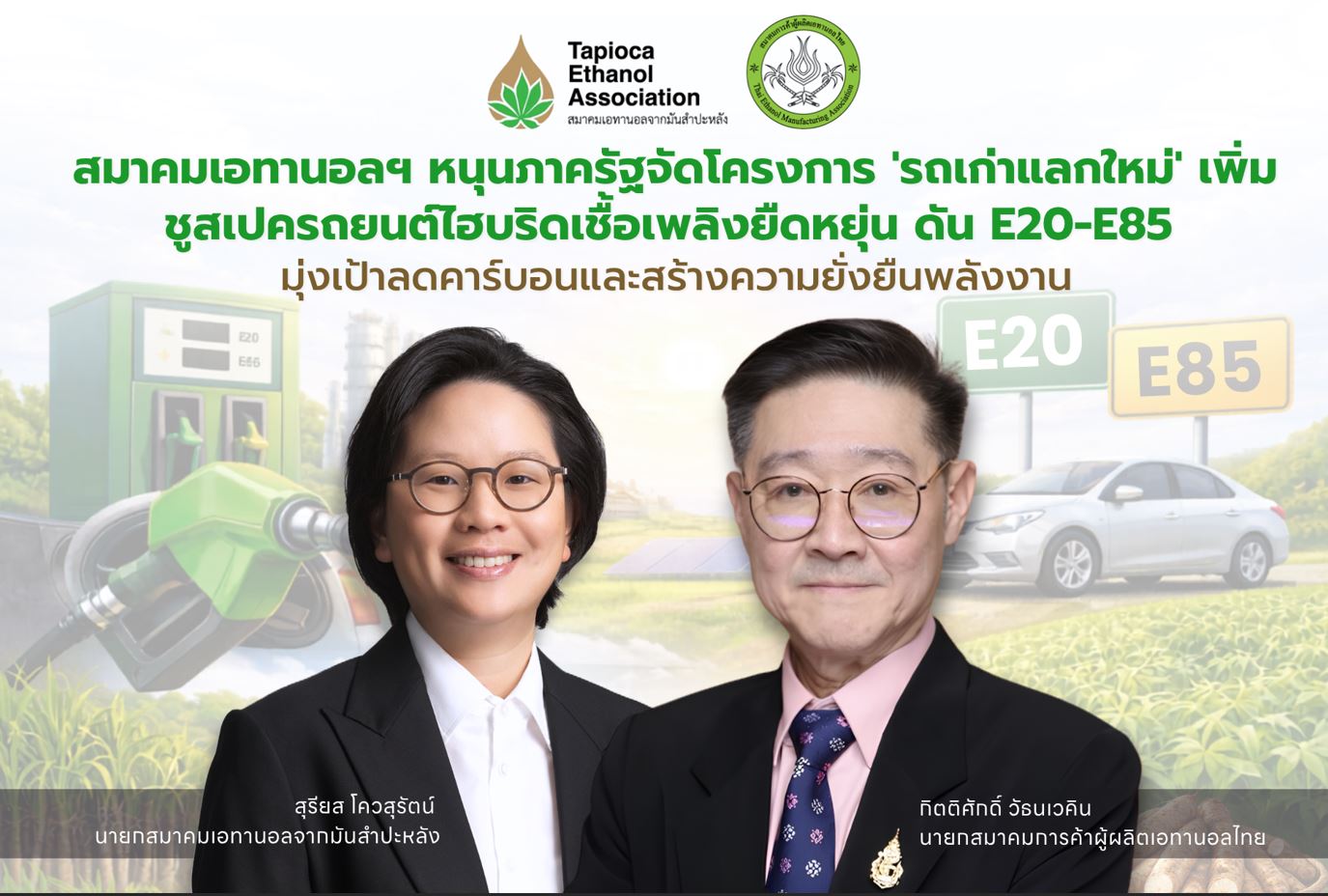 สมาคมการค้าผู้ผลิตเอทานอลไทย ร่วมกับสมาคมเอทานอลจากมันสำปะหลัง เดินหน้าสนับสนุนนโยบายภาครัฐ มุ่งยกระดับการเปลี่ยนผ่านสู่ยานยนต์มลพิษต่ำ ชูสเปครถยนต์ไฮบริดเชื้อเพลิงยืดหยุ่น (FFV-PHEV) เทคโนโลยีการเผาไหม้สะอาดมีประสิทธิภาพสูง รองรับการใช้เชื้อเพลิง E20 และ E85 ชี้ศักยภาพการผลิตเอทานอลที่แข็งแกร่งและพร้อมรองรับความต้องการใช้งานที่เพิ่มขึ้น เผยการยกระดับ E20 ให้เป็นน้ำมันเบนซินพื้นฐาน (Base Grade) ช่วยลดการนำเข้าน้ำมันได้อย่างมีนัยสำคัญ สร้างความมั่นคงทางพลังงานให้กับประเทศไทย และลดปัญหาฝุ่น PM 2.5