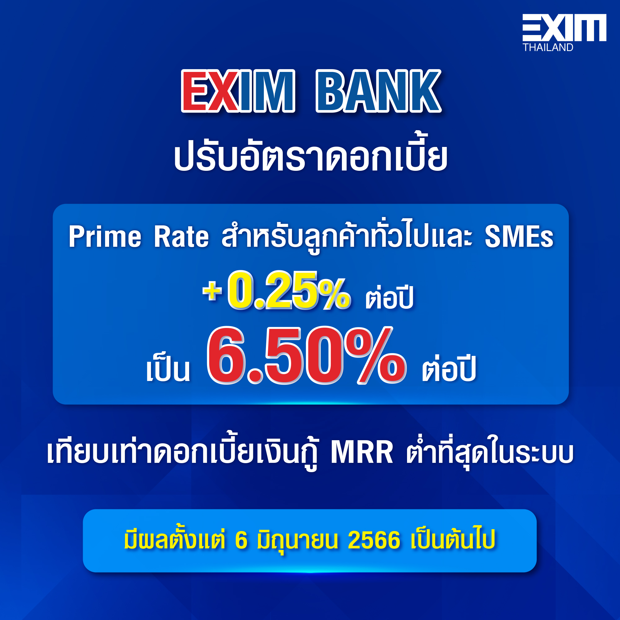 ซึ่งจะช่วยให้การฟื้นตัวของเศรษฐกิจไทยเป็นไปอย่างมีเสถียรภาพ EXIM BANK จึงประกาศปรับอัตราดอกเบี้ย Prime Rate 0.25% ต่อปี จาก 6.25% ต่อปี เป็น 6.50% ต่อปี ซึ่งยังคงเป็นอัตราดอกเบี้ยเงินกู้ลูกค้ารายย่อยชั้นดีที่ต่ำที่สุดในระบบ มีผลตั้งแต่วันที่ 6 มิถุนายน 2566 เป็นต้นไป