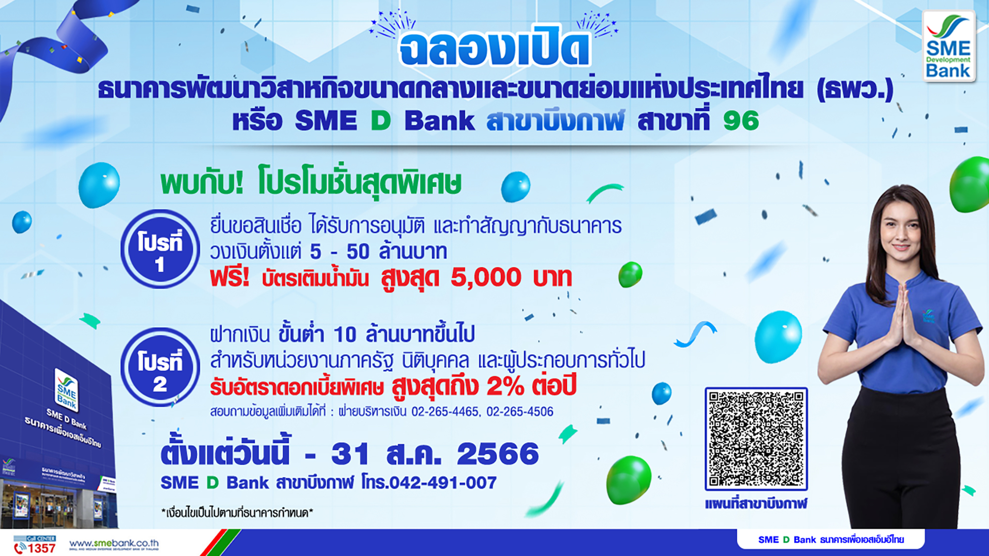 ทั้งนี้ เนื่องในโอกาสเปิดสาขาใหม่ จ.บึงกาฬ จึงจัด 2 โปรโมชั่นสุดพิเศษ เมื่อใช้บริการ SME D Bank สาขาบึงกาฬ ตั้งแต่วันนี้ ถึง 31 สิงหาคม 2566 รับสิทธิประโยชน์พิเศษ ได้แก่ 1. รับฟรี! บัตรเติมน้ำมัน มูลค่าสูงสุด 5,000 บาท เมื่อยื่นขอสินเชื่อและได้รับอนุมัติ วงเงินตั้งแต่ 5-50 ล้านบาท