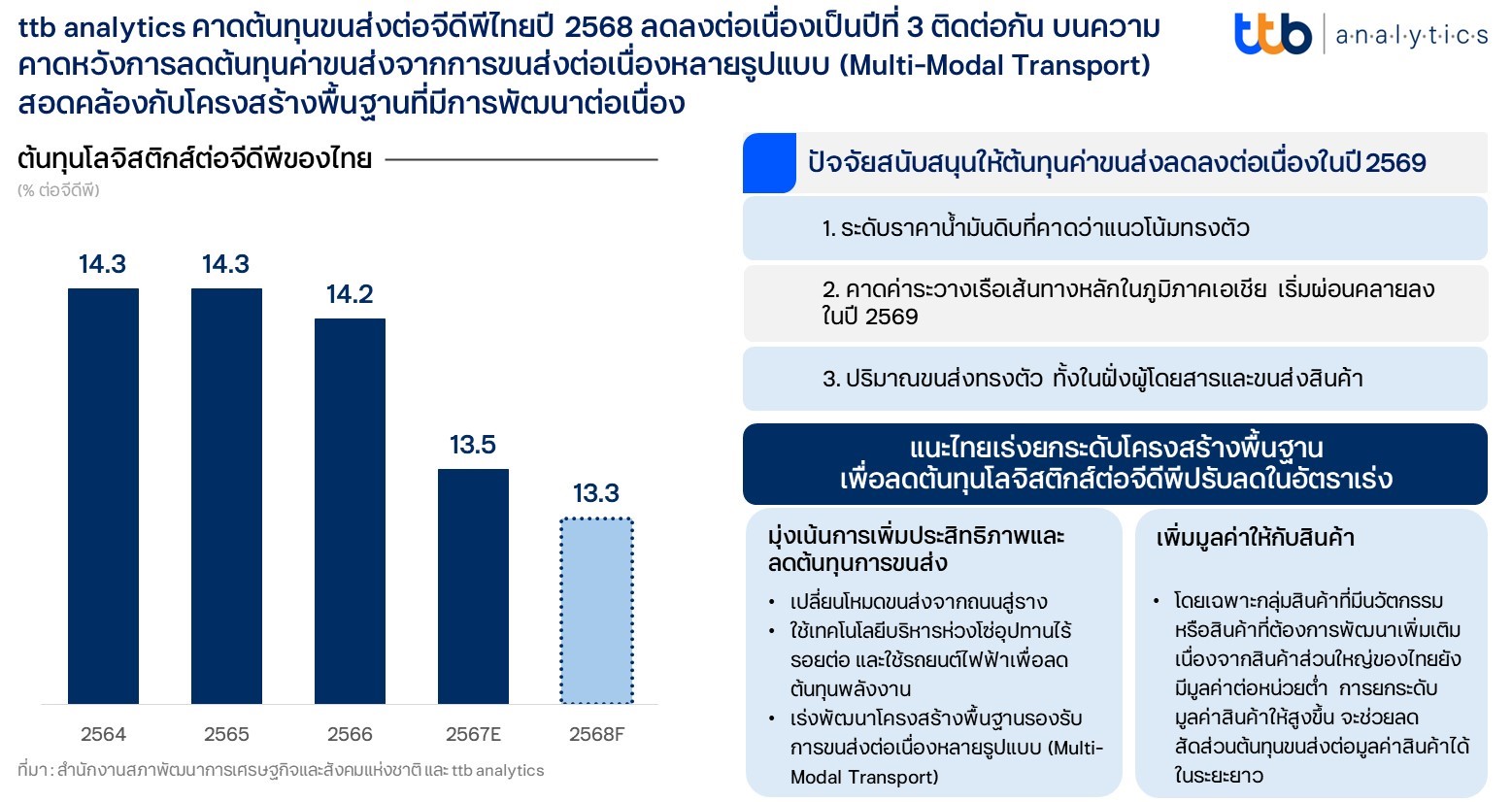 รวมถึงในปี 2569 มุมมองของ ttb analytics คาดแนวโน้มต้นทุนโลจิสติกส์ต่อจีดีพีของไทยมีโอกาสปรับลดลงใกล้ระดับ 13.0% จากแนวโน้มราคาน้ำมันดิบเฉลี่ยในปีหน้าคาดว่าจะอยู่ในระดับใกล้เคียงกับปีนี้ แนวโน้มค่าระวางเรือที่คาดผ่อนคลายลงโดยเฉพาะเส้นทางเอเชียที่ปรับเพิ่มสูงไปแล้วในปี 2568 สถานการณ์การขนส่งทางอากาศที่คาดว่ายังฟื้นตัวได้ต่ำจากภาคท่องเที่ยว ตามทิศทางเศรษฐกิจโลกที่คาดว่าจะเติบโตในอัตราที่ชะลอตัวลง ส่งผลให้สถานการณ์ภาคการค้าที่มีความสัมพันธ์กับการขนส่งทางบกอาจปรับเพิ่มขึ้นไม่มากนัก