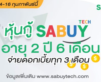 SABUY เปิดขายหุ้นกู้ดอกเบี้ยสูง 6.45% อายุ 2 ปี 6 เดือน 1,500 ล้านบาท จอง 14-16 กุมภานี้ รองรับลงทุนธุรกิจใหม่ ในไทยและอาเซียน ขยาย Ecosystem และเพิ่มเงินทุนหมุนเวียน ชูจุดเด่น กำไรเติบโตสูง 605% อัตราหนี้สินที่เสียดอกเบี้ยต่อทุนต่ำเพียง 0.35 เท่า