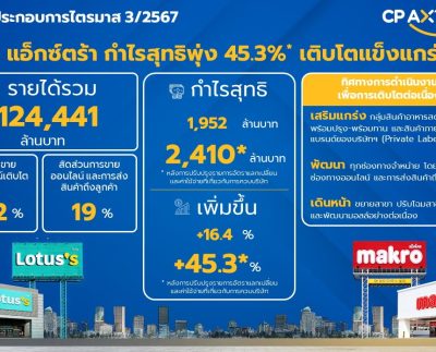 ซีพี แอ็กซ์ตร้า ไตรมาส 3/2567 โชว์กำไรสุทธิ(1) 2,410 ล้านบาท เติบโต 45% สัดส่วนยอดขาย Omni Channel เพิ่มขึ้นโดดเด่น ตั้งเป้าสร้างรายได้และกำไรเติบโตต่อเนื่อง