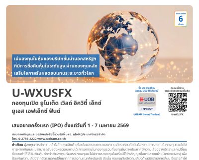 บลจ. ยูโอบี เปิดตัวกองทุนเปิด ยูไนเต็ด เวิลด์ อิควิตี้ เอ็กซ์ ยูเอส เอฟเอ็กซ์ ฟันด์ (U-WXUSFX) ลงทุนหุ้นของบริษัทชั้นนำนอกสหรัฐฯ ที่มีการรับซื้อคืนหุ้น (Buy Back) ผ่านกองทุนหลัก เพื่อโอกาสรับผลตอบแทนระยะยาวทั่วโลก เสนอขายครั้งแรก ระหว่างวันที่ 1 – 7 เมษายน 2569