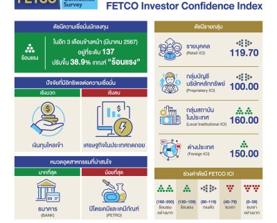 “ดัชนีความเชื่อมั่นนักลงทุนปรับขึ้นสู่เกณฑ์ ‘ร้อนแรง’ นักลงทุนคาดหวังปัจจัยหนุนจากเงินทุนไหลเข้าและท่องเที่ยวฟื้นตัว ปัจจัยฉุดคือเศรษฐกิจในประเทศถดถอย และเฟดขึ้นดอกเบี้ย”