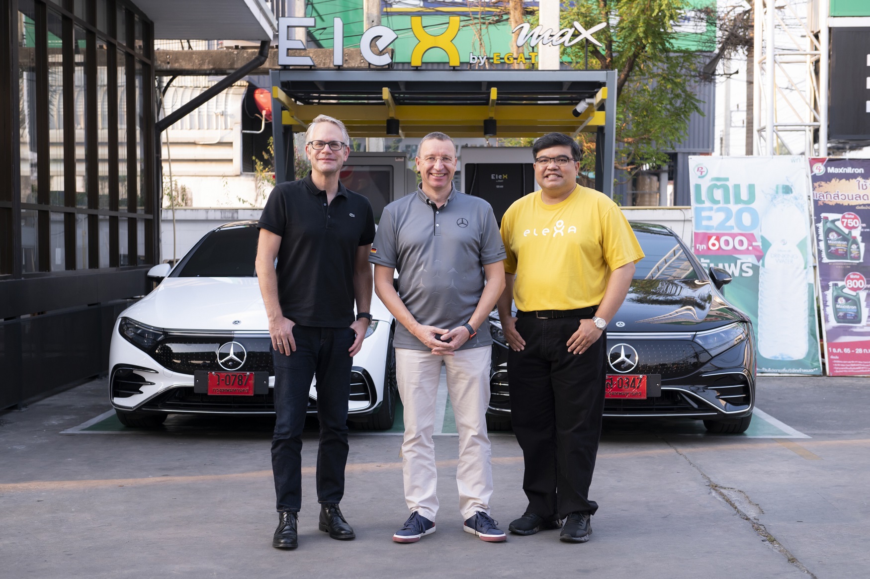 มร. มาร์ทิน ชเวงค์ ประธานบริหาร บริษัท เมอร์เซเดส-เบนซ์ (ประเทศไทย) จำกัด และ มร. บีเยิร์น กุซเทรา รองประธานบริหารฝ่ายขายและการตลาด บริษัท เมอร์เซเดส-เบนซ์ (ประเทศไทย) จำกัด พร้อมกับ นายวฤต รัตนชื่น ผู้ช่วยผู้ว่าการวิจัย นวัตกรรม และพัฒนาธุรกิจ ทำหน้าที่ Project Management Office การไฟฟ้าฝ่ายผลิตแห่งประเทศไทย (กฟผ.) ถ่ายภาพร่วมกันระหว่างทริปการทดสอบการขับขี่รถยนต์ไฟฟ้า 100% รุ่น EQS 500 4MATIC AMG Premium