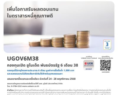 บลจ.ยูโอบี  นำเสนอโอกาสลงทุนในพันธบัตรภาครัฐ กองทุนเปิด ยูไนเต็ด พันธบัตรรัฐ 6 เดือน 38 (UGOV6M38) IPO 24-28 พฤศจิกายน 2568