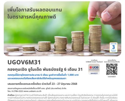 บลจ.ยูโอบี นำเสนอโอกาสลงทุนในพันธบัตรภาครัฐ กองทุนเปิด ยูไนเต็ด พันธบัตรรัฐ 6 เดือน 31 (UGOV6M31) IPO 23-27 มิถุนายน 2568บลจ.ยูโอบี นำเสนอโอกาสลงทุนในพันธบัตรภาครัฐ กองทุนเปิด ยูไนเต็ด พันธบัตรรัฐ 6 เดือน 31 (UGOV6M31) IPO 23-27 มิถุนายน 2568