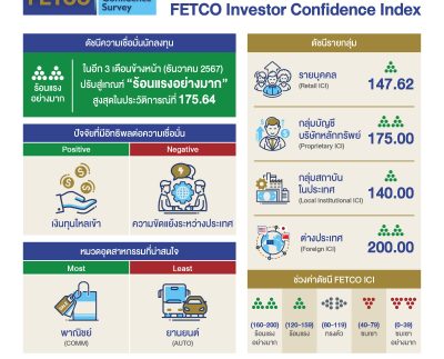“ดัชนีความเชื่อมั่นนักลงทุนปรับสู่เกณฑ์ร้อนแรงอย่างมาก สูงสุดเป็นประวัติการณ์ นักลงทุนคาดหวังปัจจัยหนุนจากเงินทุนไหลเข้าและมาตรการกระตุ้นเศรษฐกิจ ปัจจัยฉุดคือความขัดแย้งระหว่างประเทศและความไม่แน่นอนทางการเมือง”