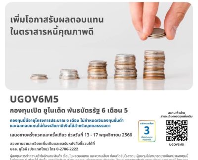 UOBAM เสนอขาย IPO กองทุนเปิด ยูไนเต็ด พันธบัตรรัฐ 6 เดือน 5 (UGOV6M5) เน้นลงทุนในพันธบัตรภาครัฐ IPO 13 – 17 พฤศจิกายน 2566
