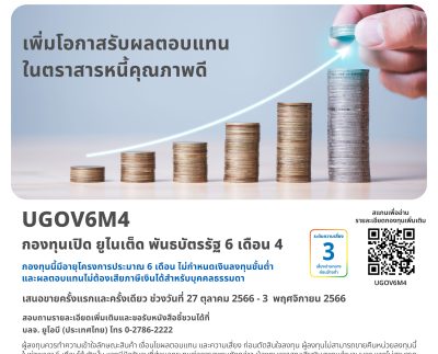 UOBAM เสนอขาย IPO กองทุนเปิด ยูไนเต็ด พันธบัตรรัฐ 6 เดือน 4 (UGOV6M4) เน้นลงทุนในพันธบัตรภาครัฐ IPO 27 ตุลาคม – 3 พฤศจิกายน 2566