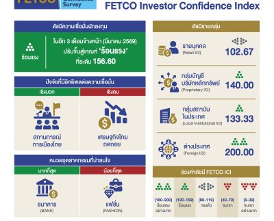 “ดัชนีความเชื่อมั่นนักลงทุนปรับขึ้นสู่เกณฑ์ ‘ร้อนแรง’ นักลงทุนจับตาแรงหนุนจากสถานการณ์การเมืองไทย และเงินทุนไหลเข้า  ปัจจัยฉุดคือเศรษฐกิจถดถอยและเงินบาทผันผวน”