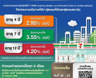‘ซีพี ออลล์’ ประกาศอัตราดอกเบี้ยหุ้นกู้ออกใหม่ 3 รุ่น ระหว่าง 2.95 – 4.20% ต่อปี พร้อมเสนอขายประชาชนเป็นการทั่วไป ระหว่างวันที่ 20 – 22 กุมภาพันธ์ 2566 ชูจุดเด่นอันดับความน่าเชื่อถือ A+ ตอกย้ำความเป็นผู้นำในธุรกิจค้าปลีก