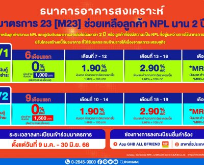 ธอส. จัดทำมาตรการที่ 23 [M23] ช่วยเหลือลูกค้าสถานะ NPLนานสูงสุด 2 ปี เลือกผ่อนชำระเริ่มต้น 1,000 บาท ดอกเบี้ย 0% นาน 6 เดือน หรือ 1,500 บาท ดอกเบี้ย 0% นาน 9 เดือน