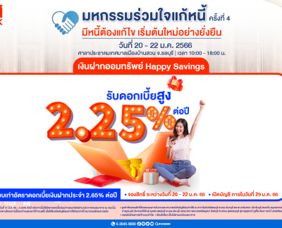 ธอส. จัดเงินฝากออมทรัพย์ Happy Savings อัตราดอกเบี้ยสูงสุด 2.25% ต่อปี เอาใจคนรักการออมในงานมหกรรมร่วมใจแก้หนี้ฯ ครั้งที่ 4 จ.ชลบุรี